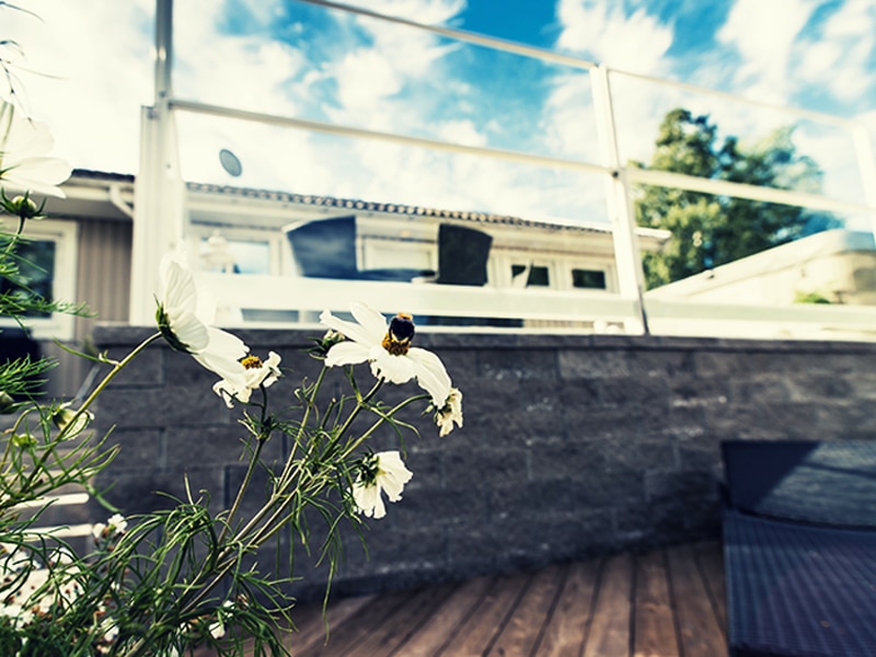 Garde-corps vitré robuste fabriqué en Suède. Quand le vent souffle, vous êtes parfaitement en confiance derrière votre CITI LA.